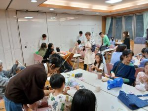 細かい雨の降る中、室内遊びコーナーはギュウギュウ状態でしたが、ボランティアが持って来てくれたシュシュ手編みコーナーには大人もけっこうハマり(^^)