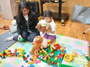 ブロックコーナーでは赤ちゃんがぬいぐるみを寝かしつけ(^^)