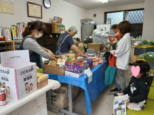 やはり匿名の方のキャベツ、スタッフ寄付のサツマイモ、柿などと一緒に八百屋さんの軒先のように並べさせていただきました(#^.^#)