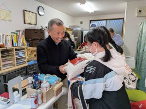 この日は日本善意財団の谷口事務局長が冬休み前の「米米プロジェクト」で、新米のブランド米5キロを各世帯に直接、手渡してくださいました。